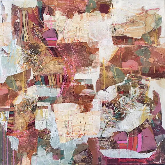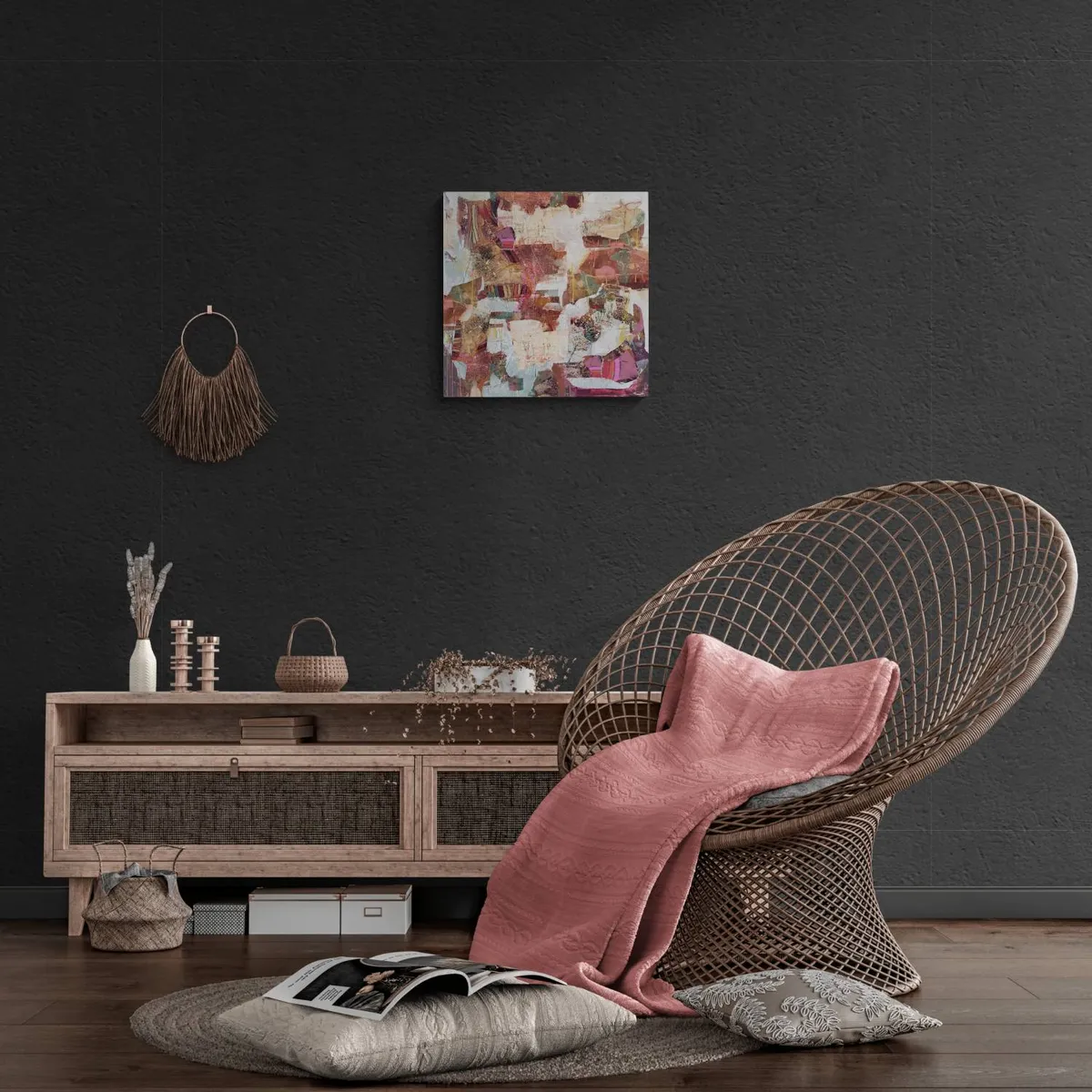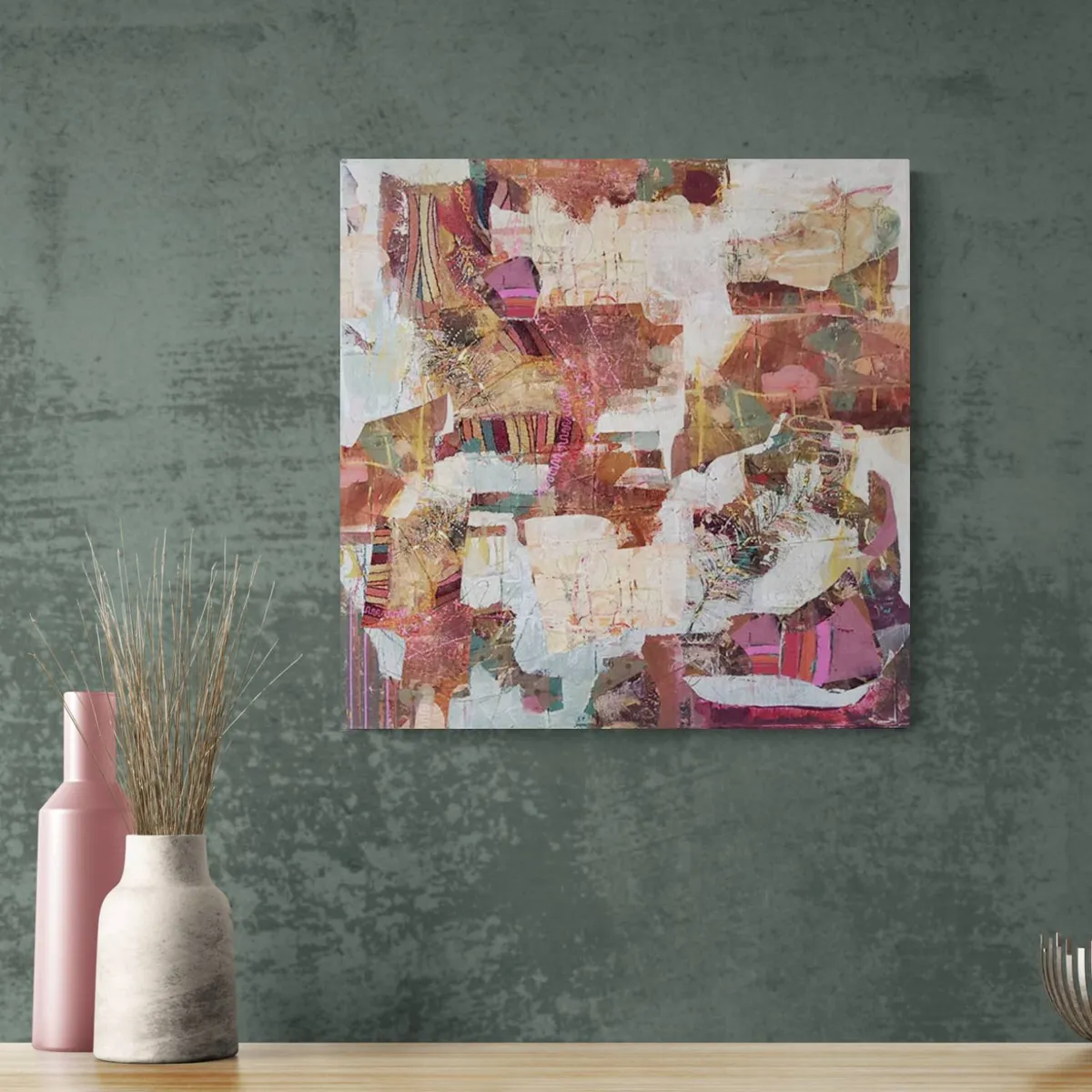 Professionelle malemedier på kvalitetslærred. Et maleri med struktur lavet med collagepapir og stof. Detaljer i guld reflekterer lyset og understreger varmen i maleriet. Kanten er malet sort og kan enten gemmes i en ramme eller fungere som en ramme i sig selv. Signatur i guld