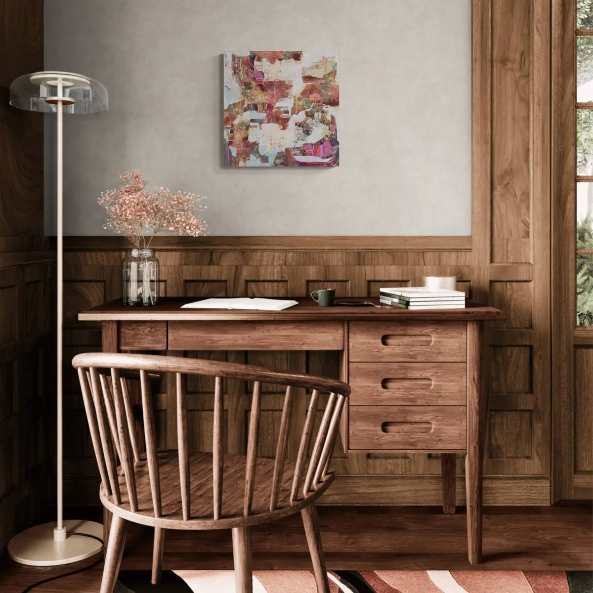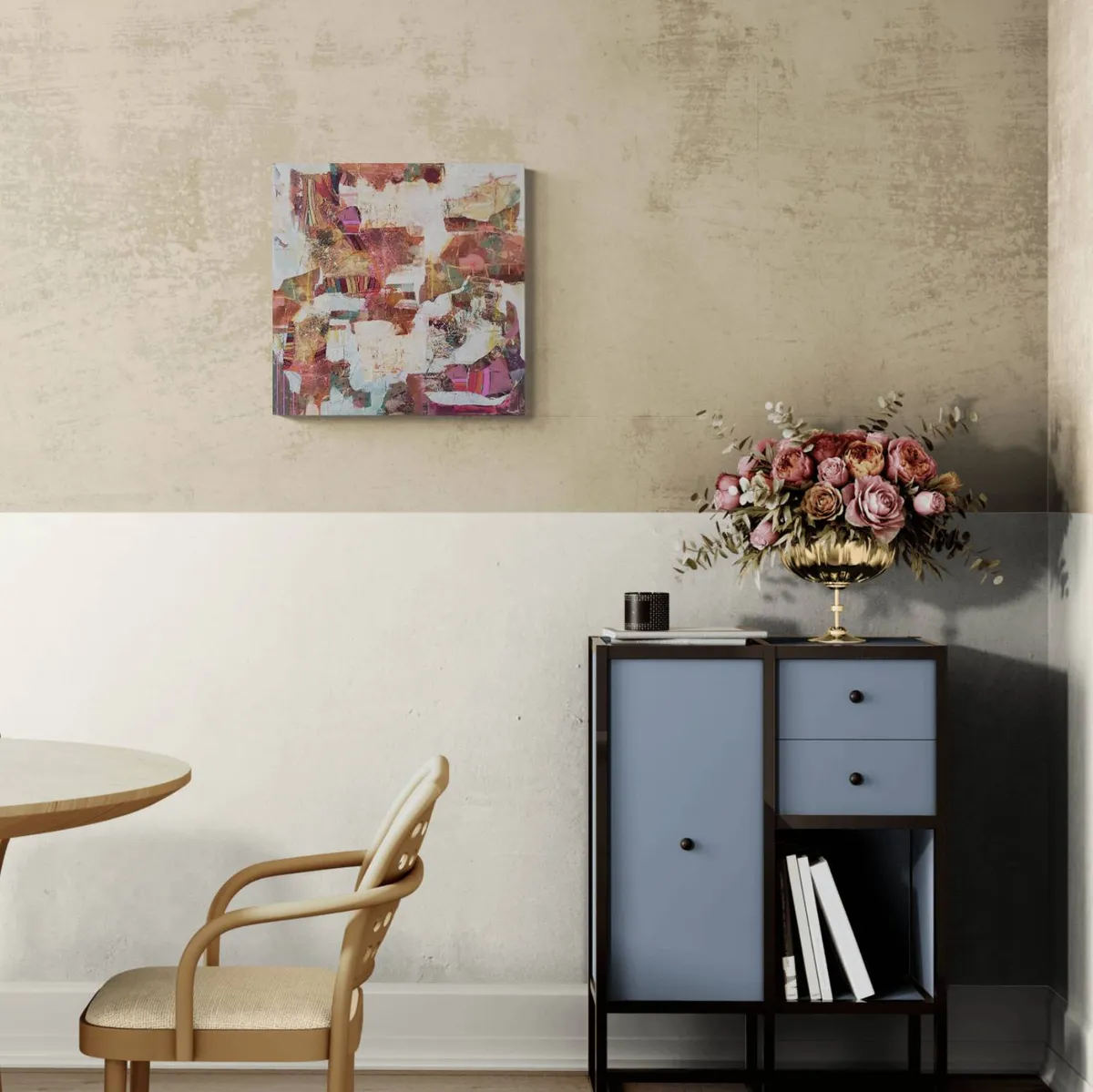 Titlen handler om det øjeblik, hvor man løfter sig – får retning, frihed og mod til at flyve videre. De støvede røde og rosa nuancer danner baggrund for gyldne fjer og små fugle i flugt. Et maleri om bevægelse og lethed.