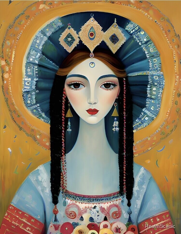 A painting of a woman holding a bouquet of flowers, sacred feminine, jeweled headdress, portrait of Zlatka, sloven style, orthodox icons. Naive art. ⓘ My logo is not printed on products.