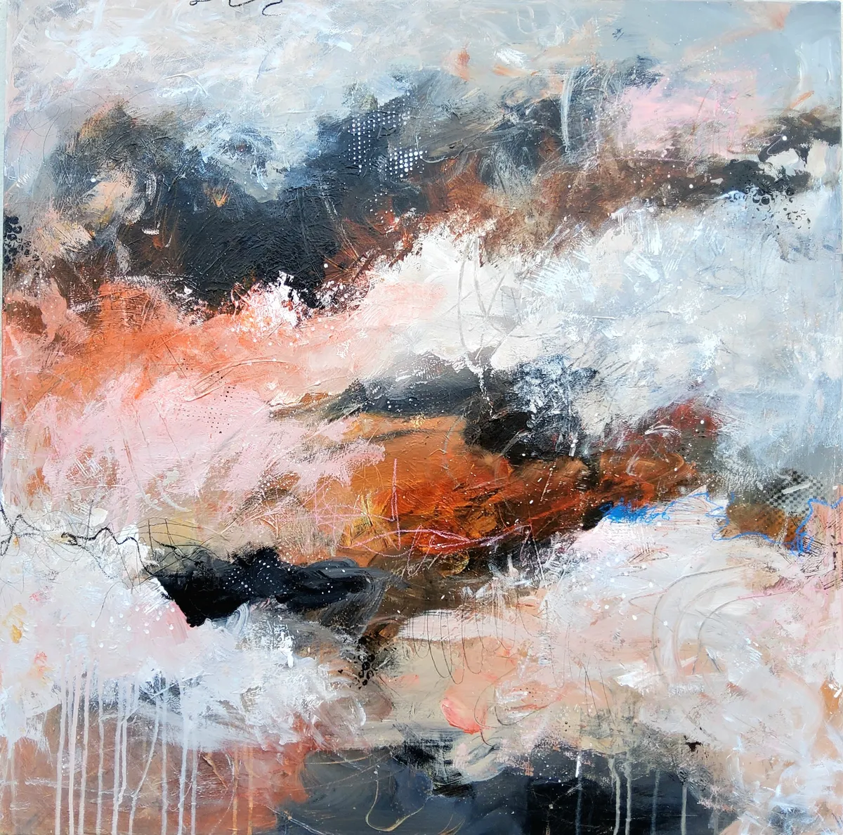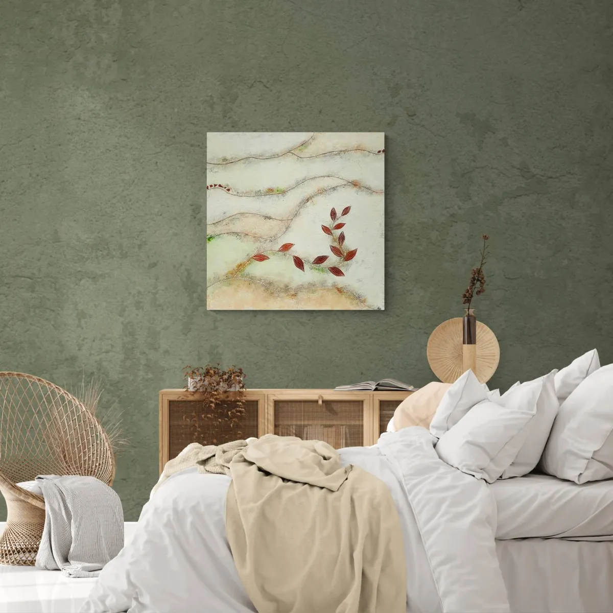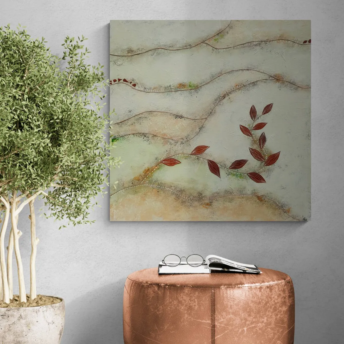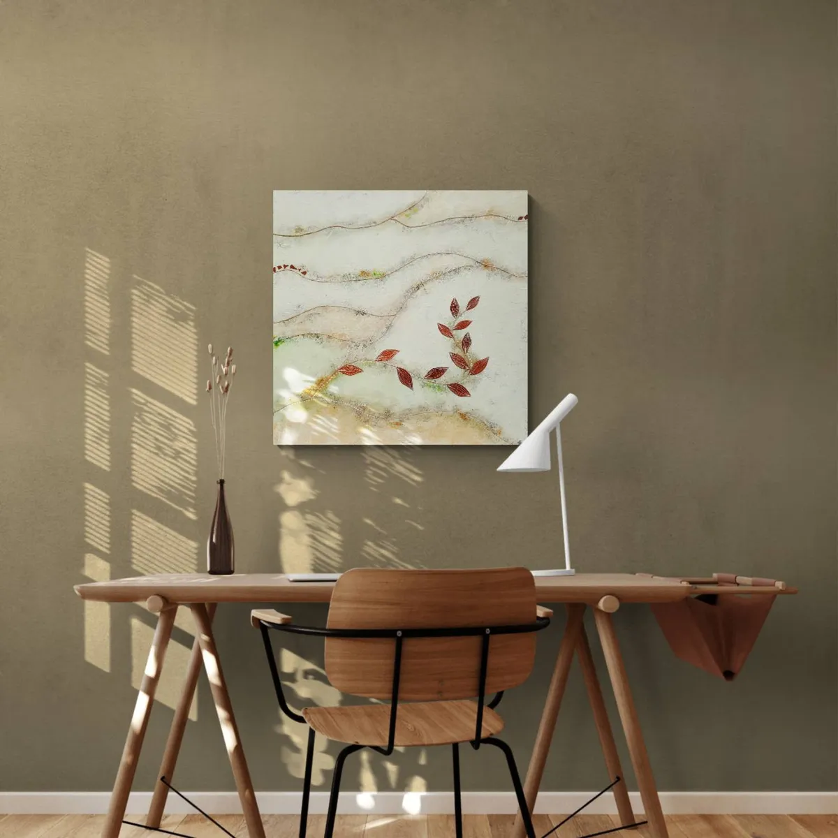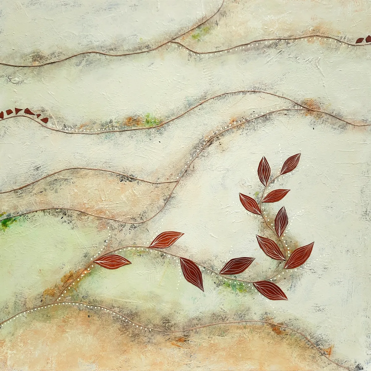 Professionelle malemedier på kvalitetslærred. Et maleri med struktur, hørsnor og læder. Rustikt og råt... men samtidig blidt og roligt. Både motiv og påsatte elementer går ud over kanterne og derfor kan maleriet fungere uden ramme.