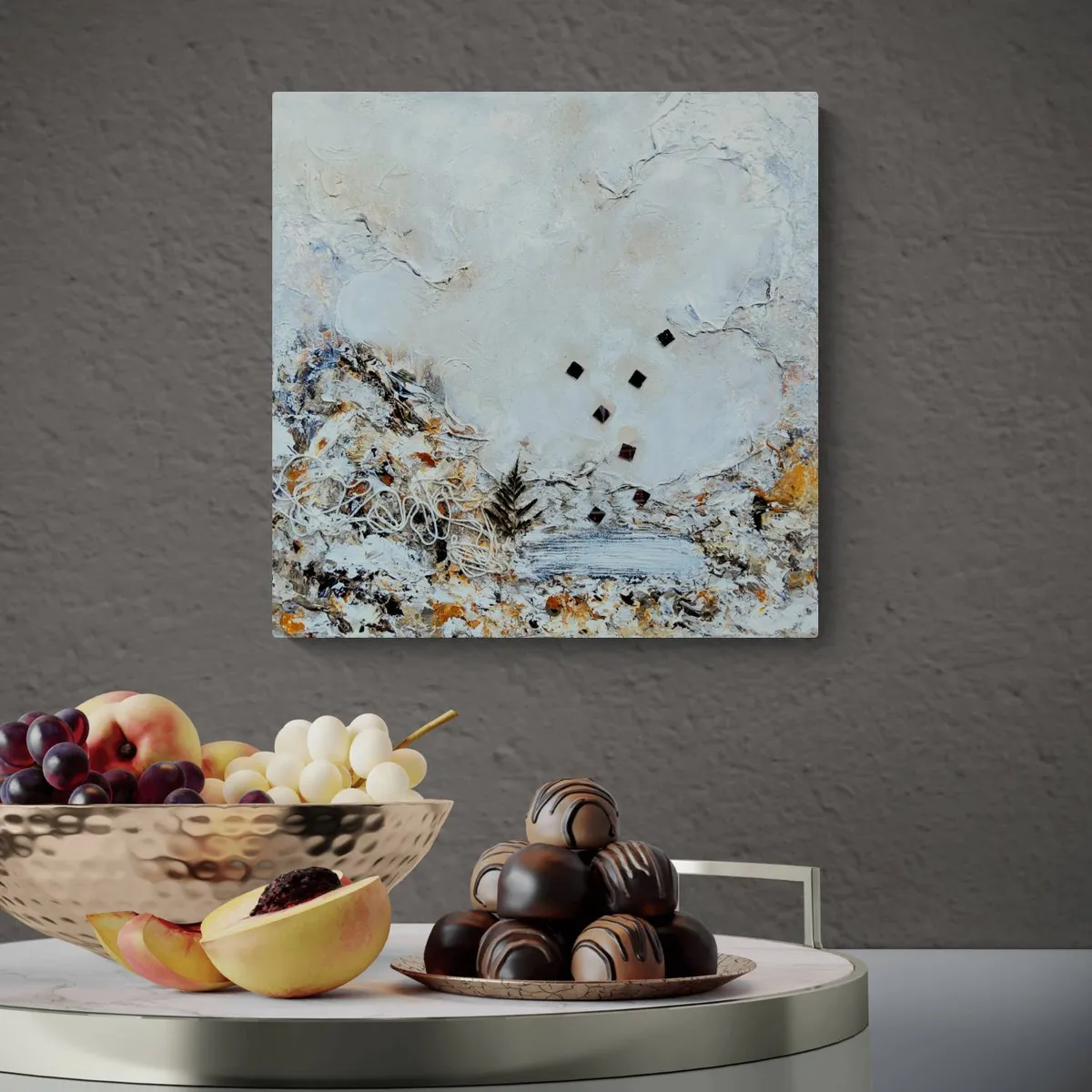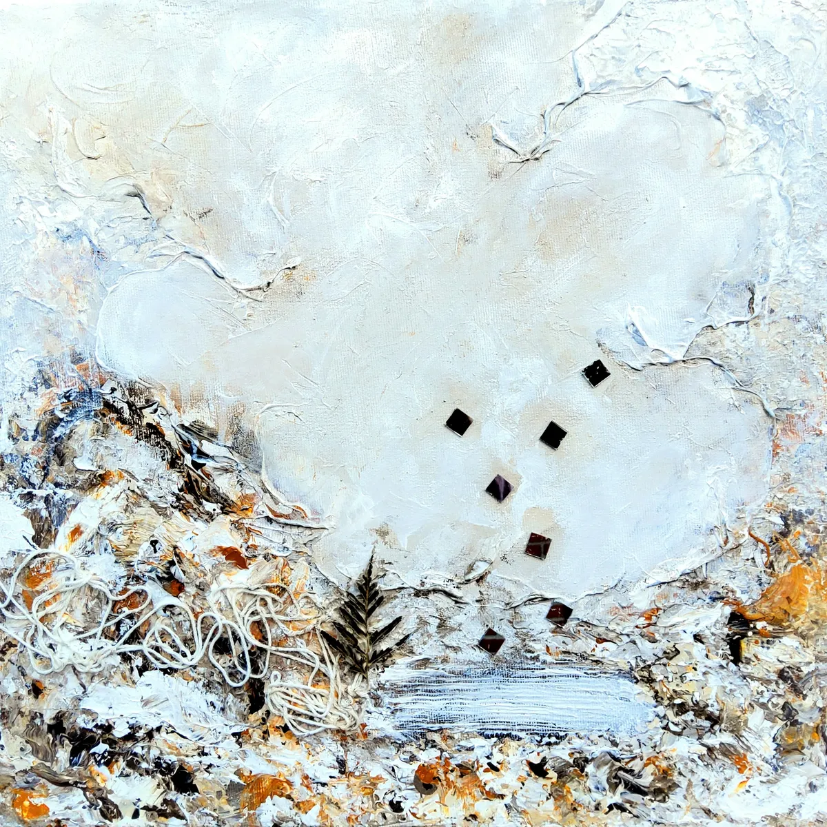 Professionelle malemedier på kvalitetslærred. Et maleri med masser af struktur, påsat 3D-elementer som spejlrelieffer, bomuldsgarn og tørret blad for ekstra dimension og interesse. Både motiv og struktur går ud over kanterne og derfor kan maleriet fungere uden ramme. Det kan hænge alene eller sættes sammen med makkeren. Signeret på bagsiden