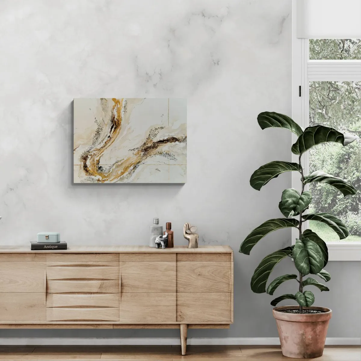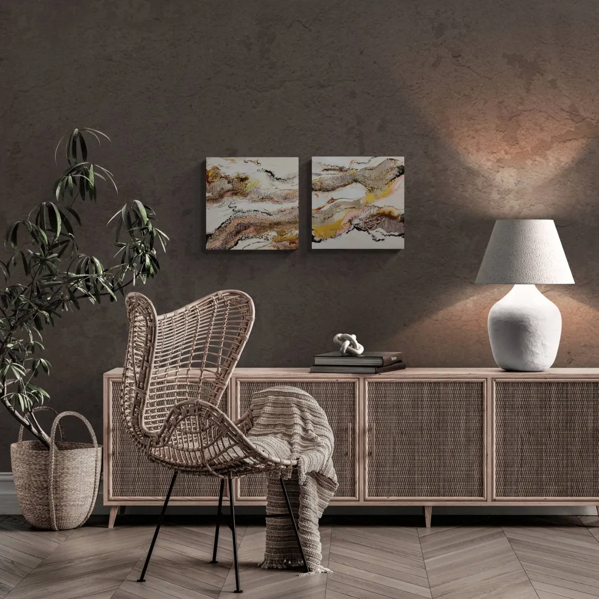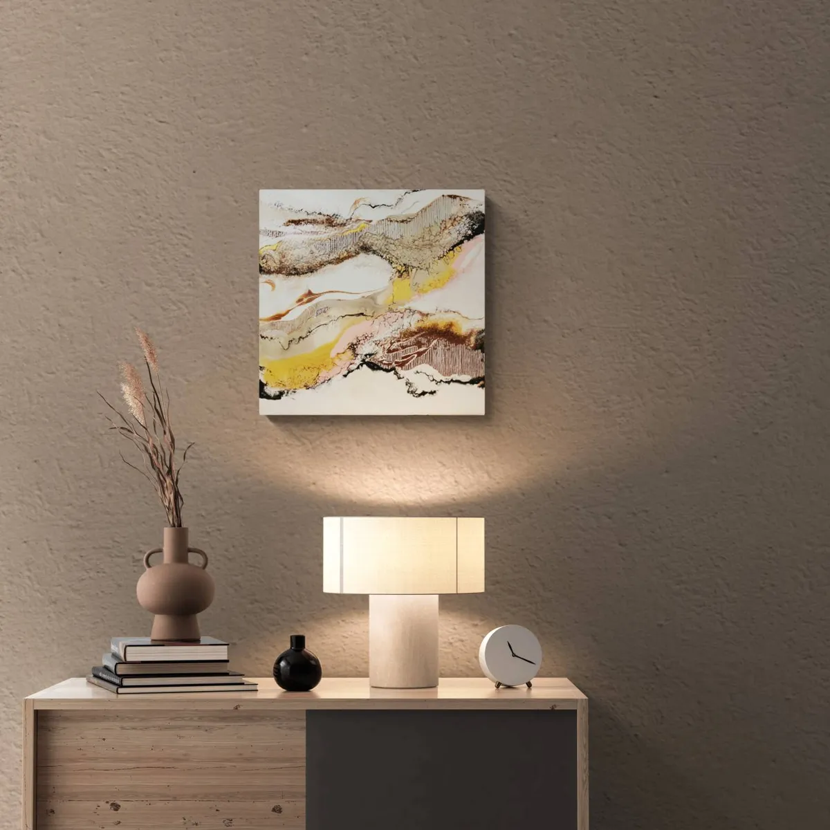Professionelle malemedier på kvalitetslærred. Et maleri med struktur lavet med sandpasta og påsatte knuste glaskrystaller. Sammen med detaljer i guld reflekterer de lyset og understreger varmen i maleriet. Kanten er malet sort og kan enten gemmes i en ramme eller fungere som en ramme i sig selv. Signatur i guld. Maleriet kan hænge alene eller sammen med dets makker som eksemplerne viser.