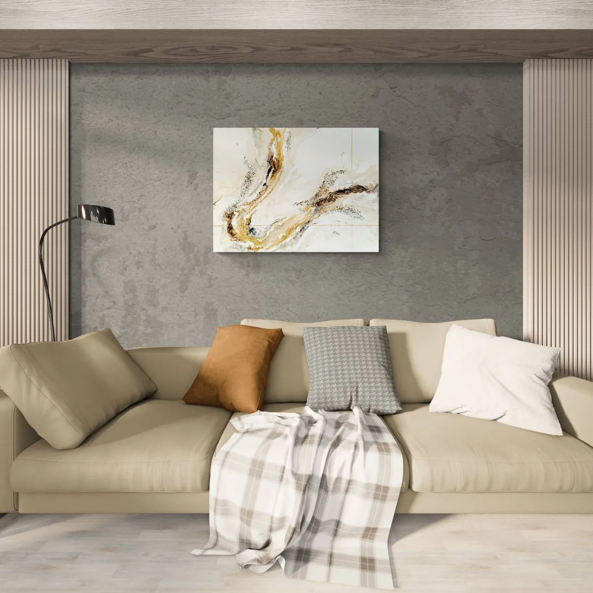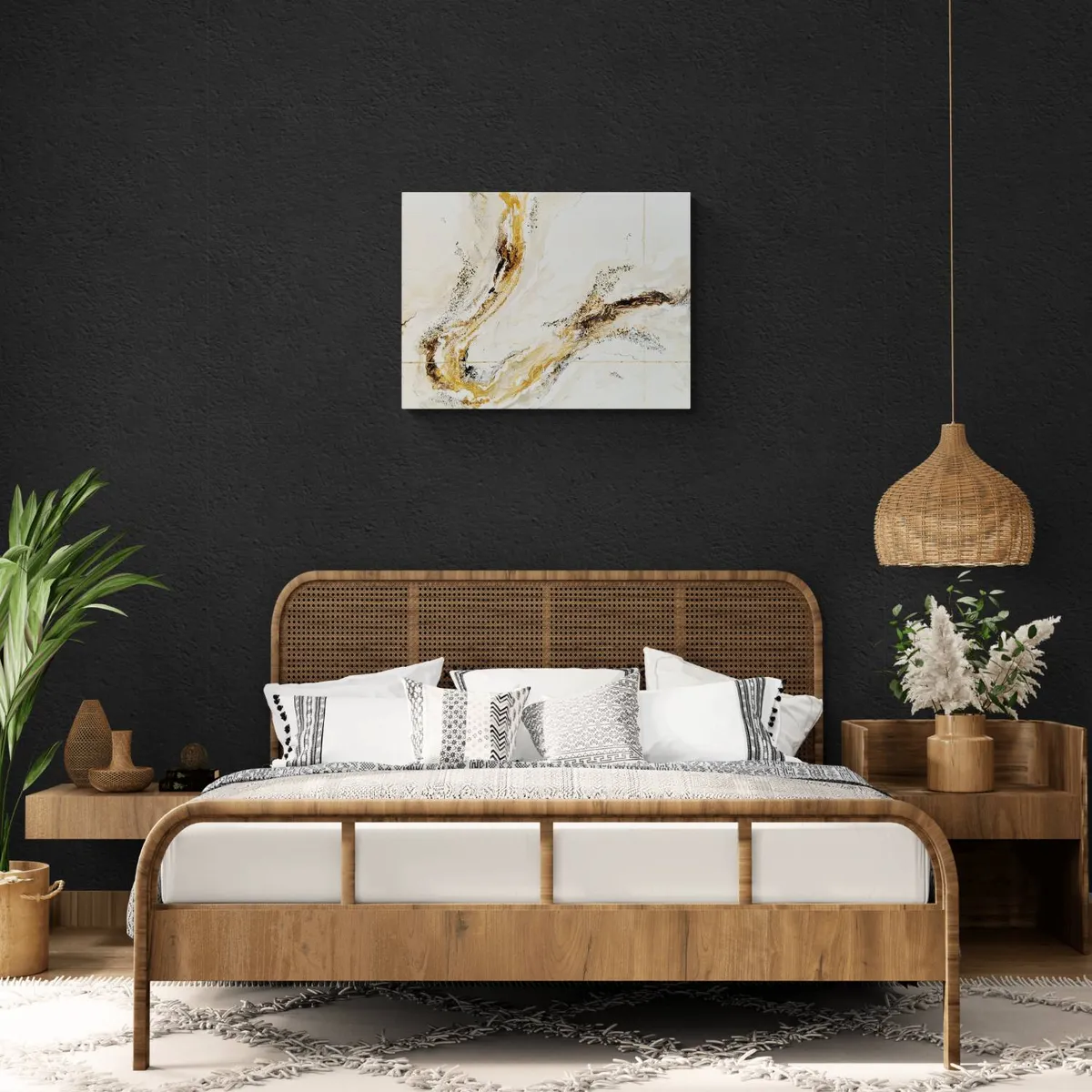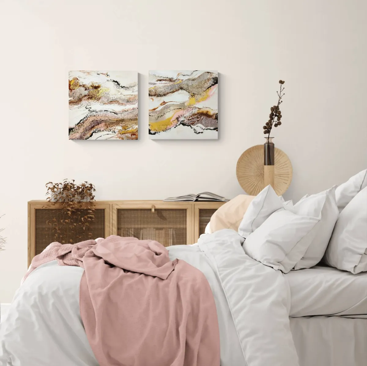 Professionelle malemedier på kvalitetslærred. Et maleri med struktur lavet med sandpasta og påsatte knuste glaskrystaller. Sammen med detaljer i guld reflekterer de lyset og understreger varmen i maleriet. Kanten er malet sort og kan enten gemmes i en ramme eller fungere som en ramme i sig selv. Signatur i guld. Maleriet kan hænge alene eller sammen med dets makker som eksemplerne viser.