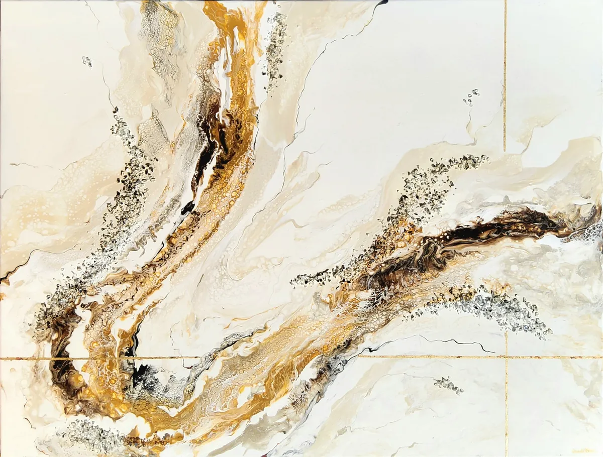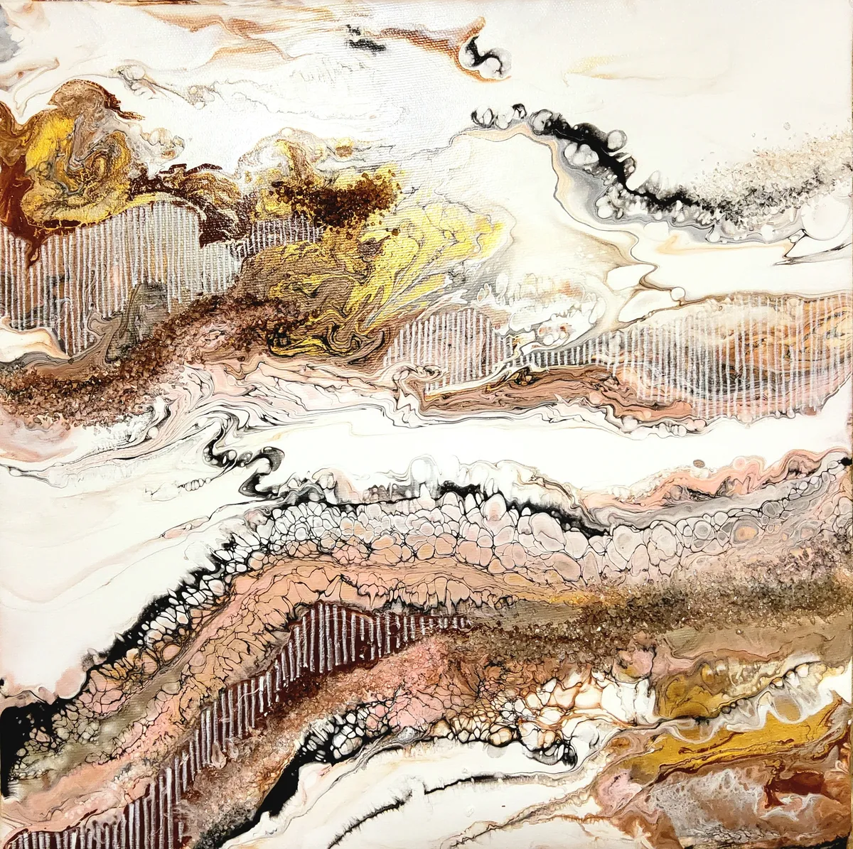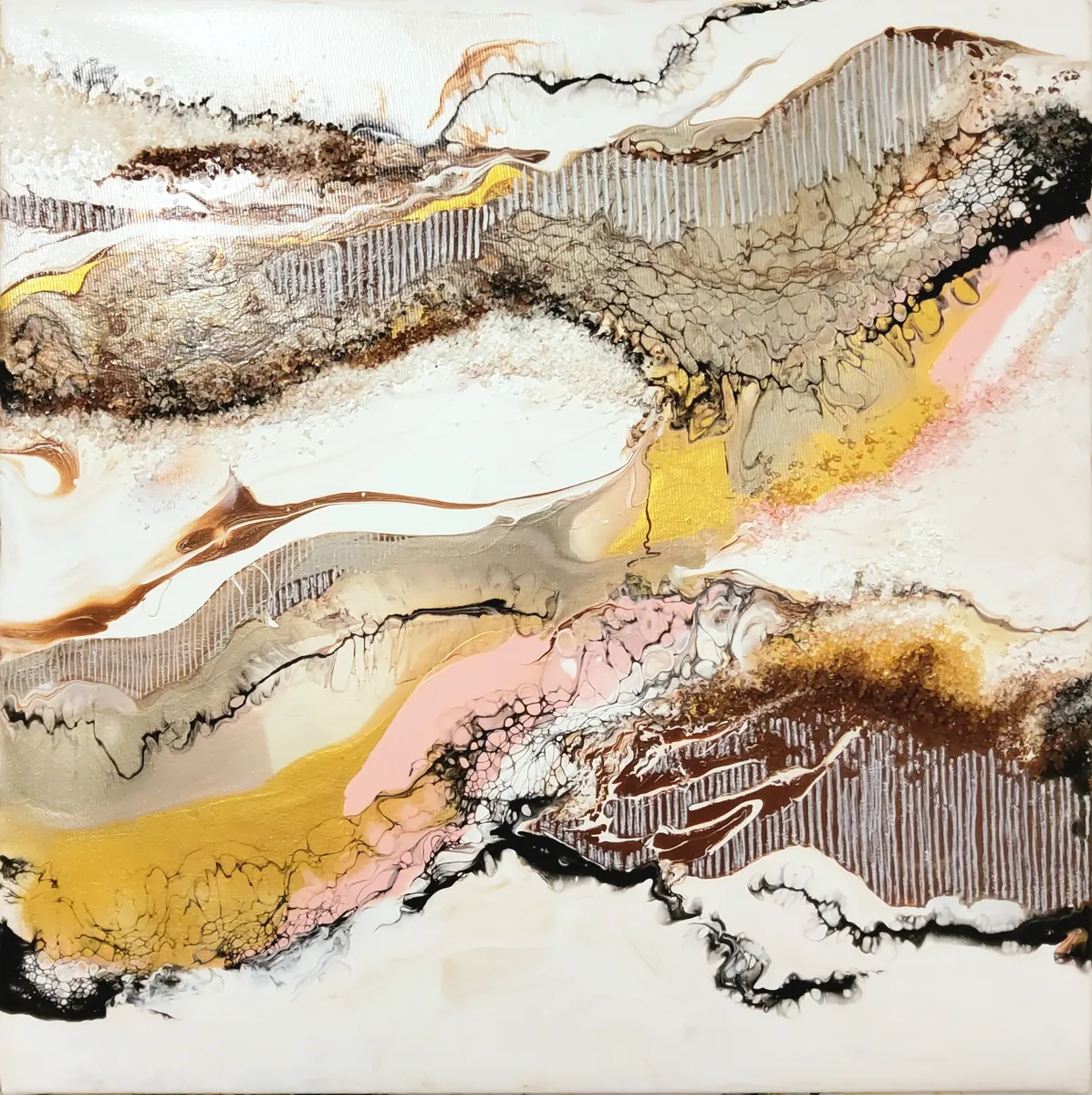 Professionelle malemedier på kvalitetslærred. Et maleri med struktur lavet med sandpasta og påsatte knuste spejlkrystaller. Sammen med detaljer i guld reflekterer de lyset og understreger varmen i maleriet. Kanten er malet sort og kan enten gemmes i en ramme eller fungere som en ramme i sig selv. Signatur i guld.