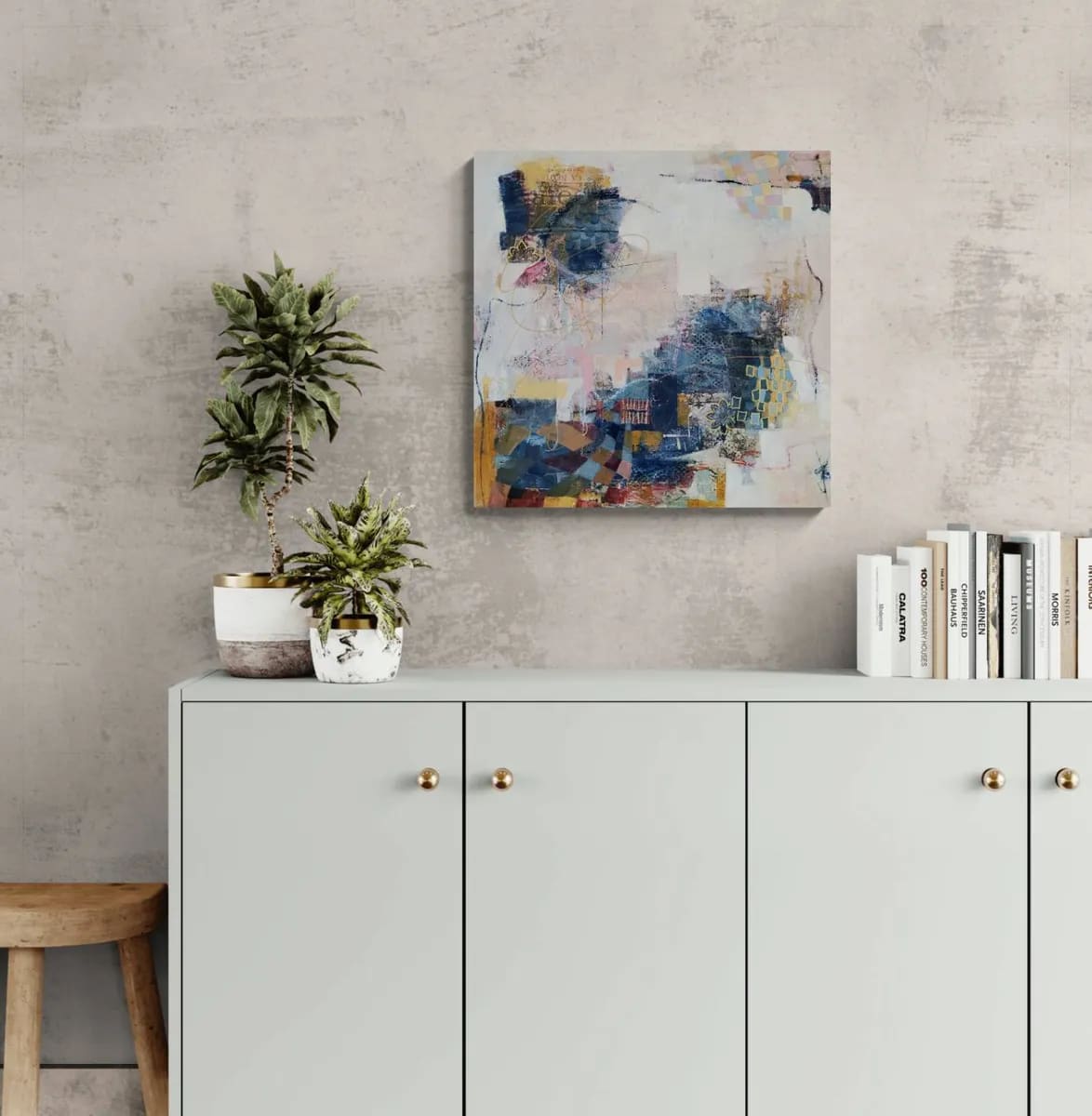 Professionelle malemedier på kvalitetslærred. Et maleri med struktur lavet med collagepapir. Detaljer i guld reflekterer lyset og understreger varmen i maleriet. Kanten er malet sort og kan enten gemmes i en ramme eller fungere som en ramme i sig selv. Signatur i guld