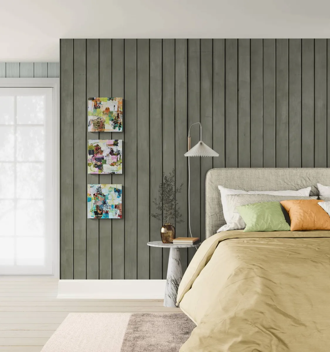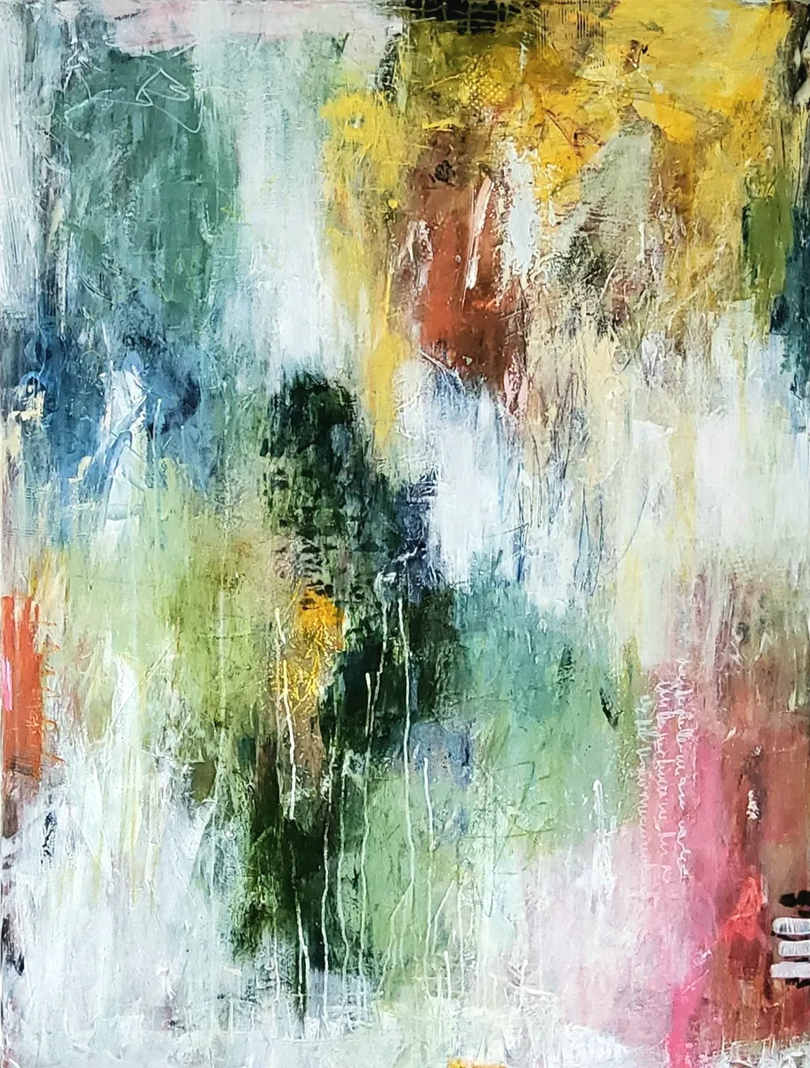 Titlen handler om det øjeblik, hvor man løfter sig – får retning, frihed og mod til at flyve videre. De støvede røde og rosa nuancer danner baggrund for gyldne fjer og små fugle i flugt. Et maleri om bevægelse og lethed.