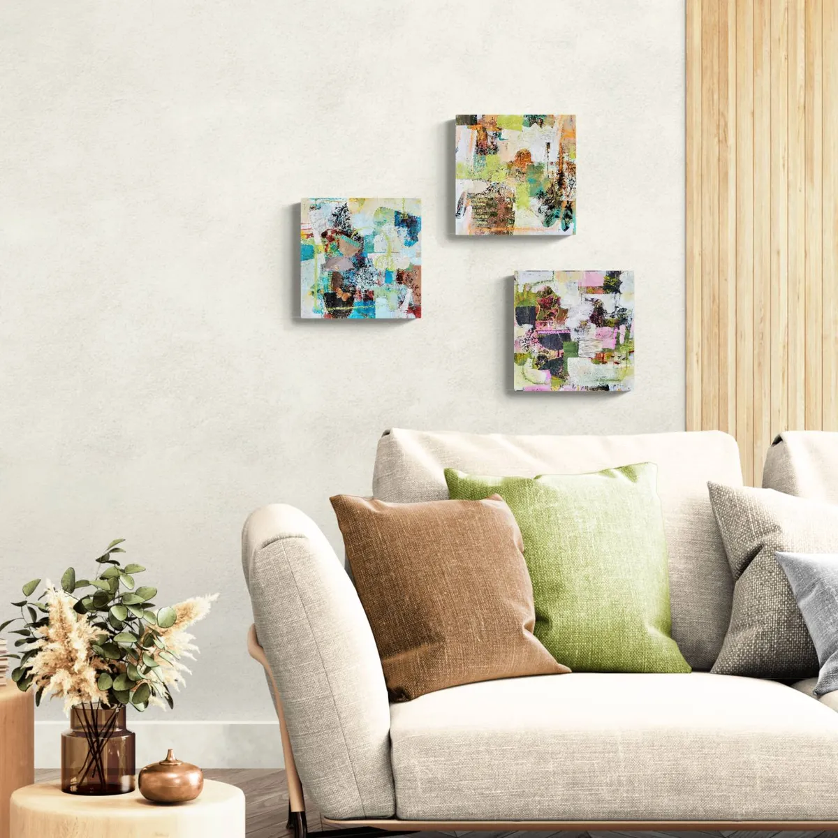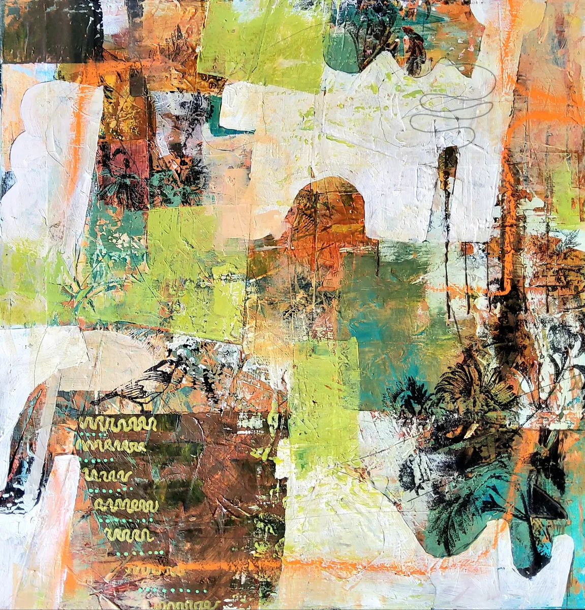 Professionelle malemedier på kvalitetslærred. Et maleri med struktur lavet med collagepapir og stof. Detaljer i guld reflekterer lyset og understreger varmen i maleriet. Kanten er malet sort og kan enten gemmes i en ramme eller fungere som en ramme i sig selv. Signatur i guld