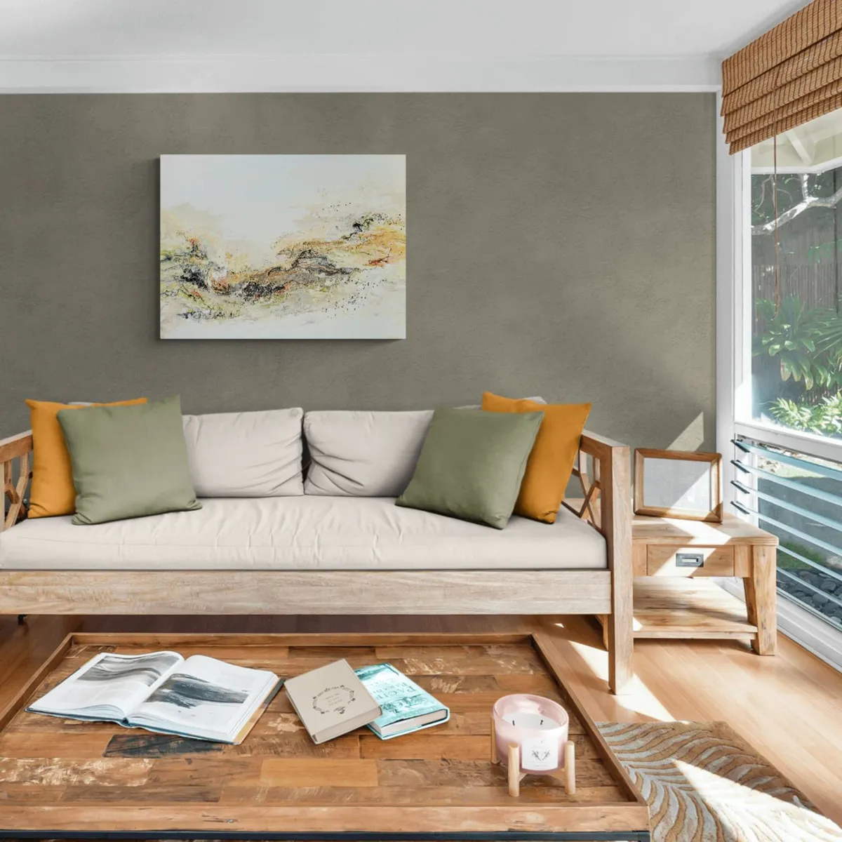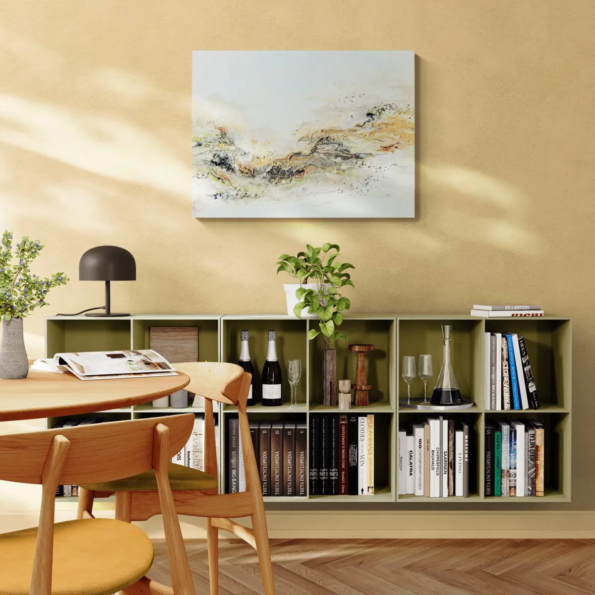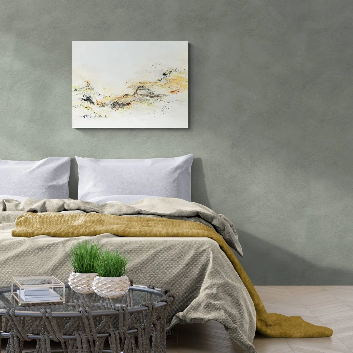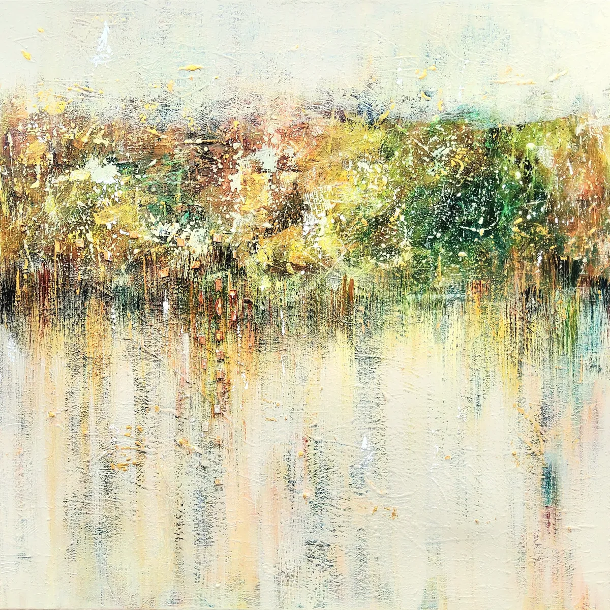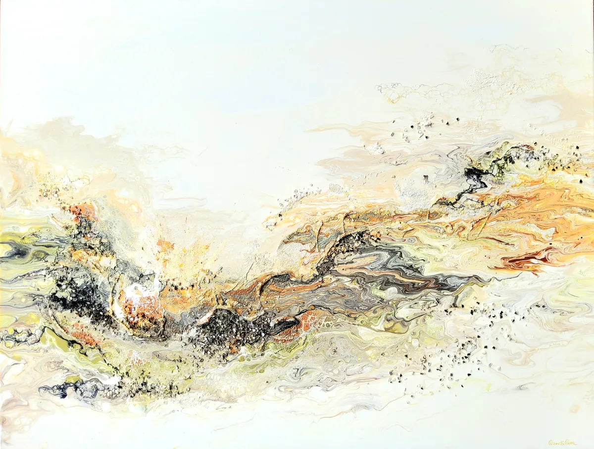 Professionelle malemedier på kvalitetslærred. Et maleri med struktur lavet med sandpasta og påsatte knuste spejlkrystaller. Sammen med detaljer i guld reflekterer de lyset og understreger varmen i maleriet. Kanten er malet sort og kan enten gemmes i en ramme eller fungere som en ramme i sig selv. Signatur i guld.