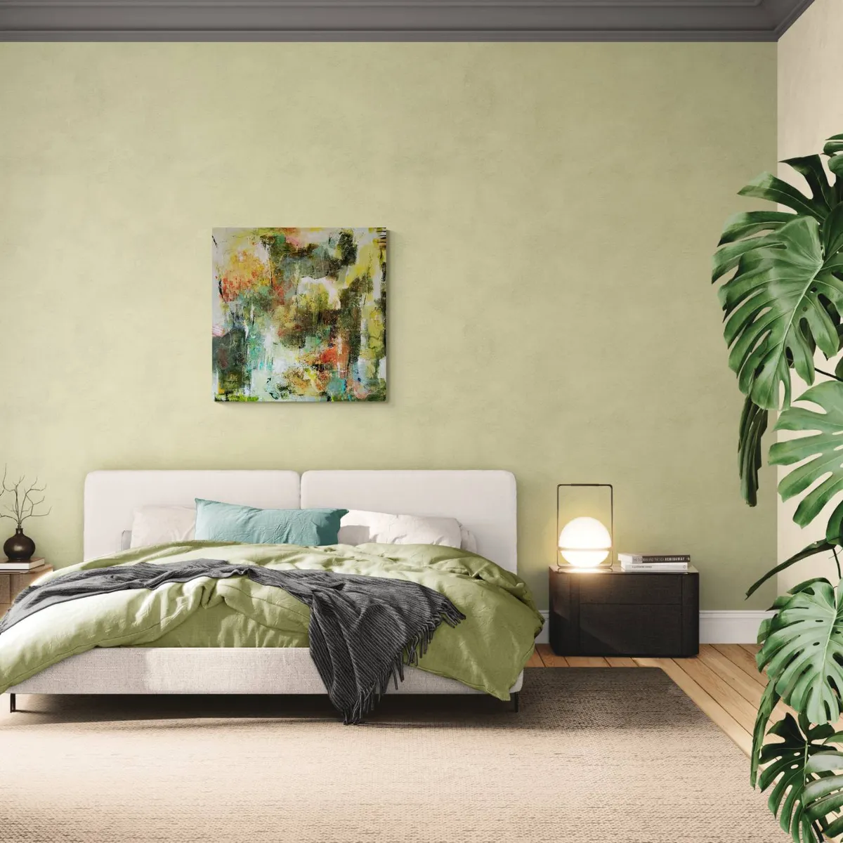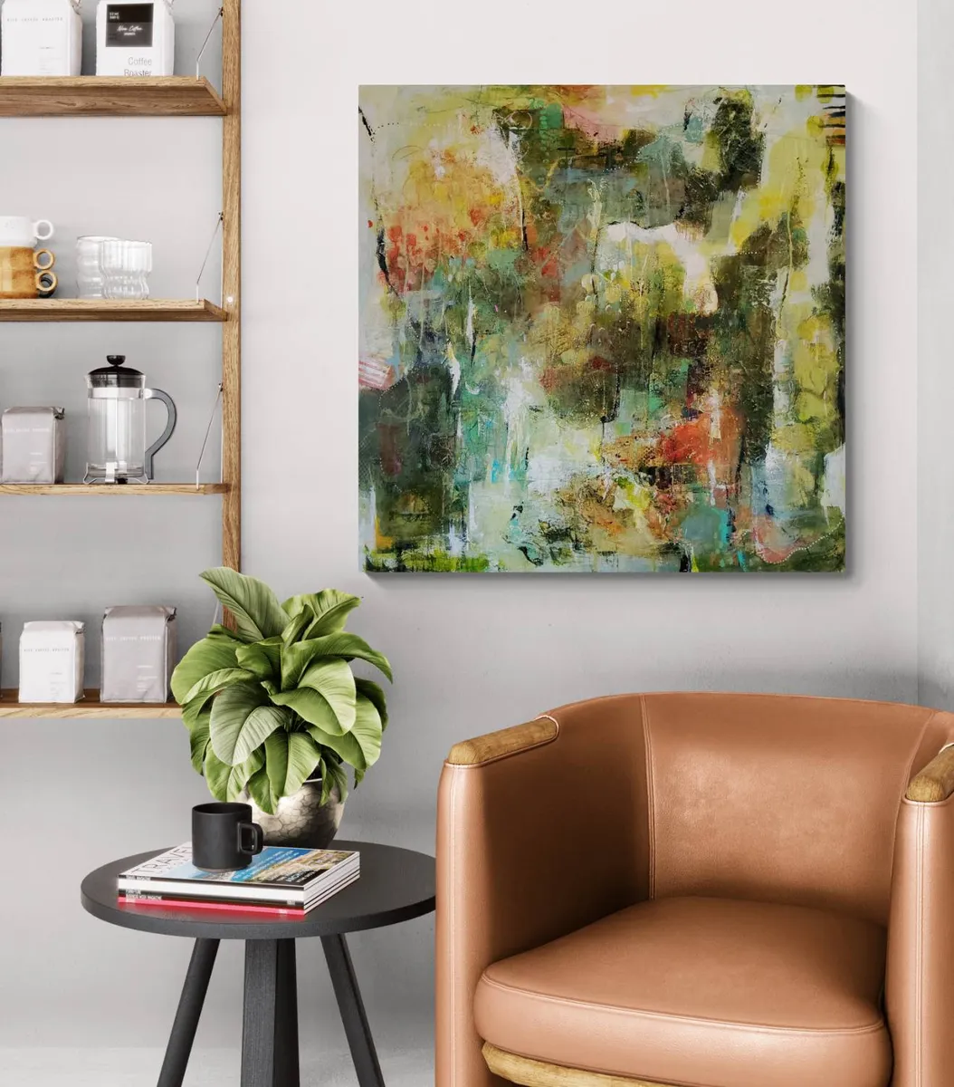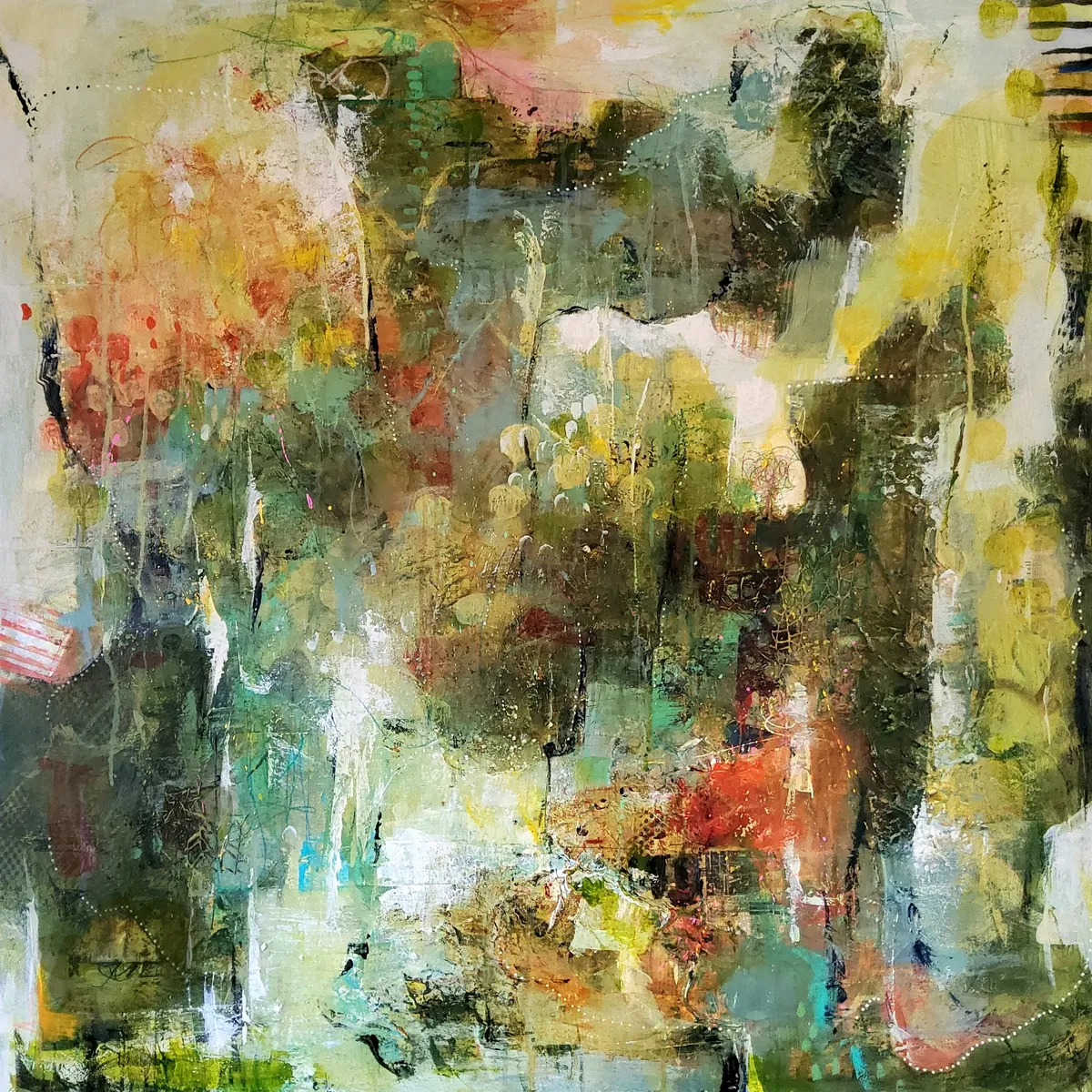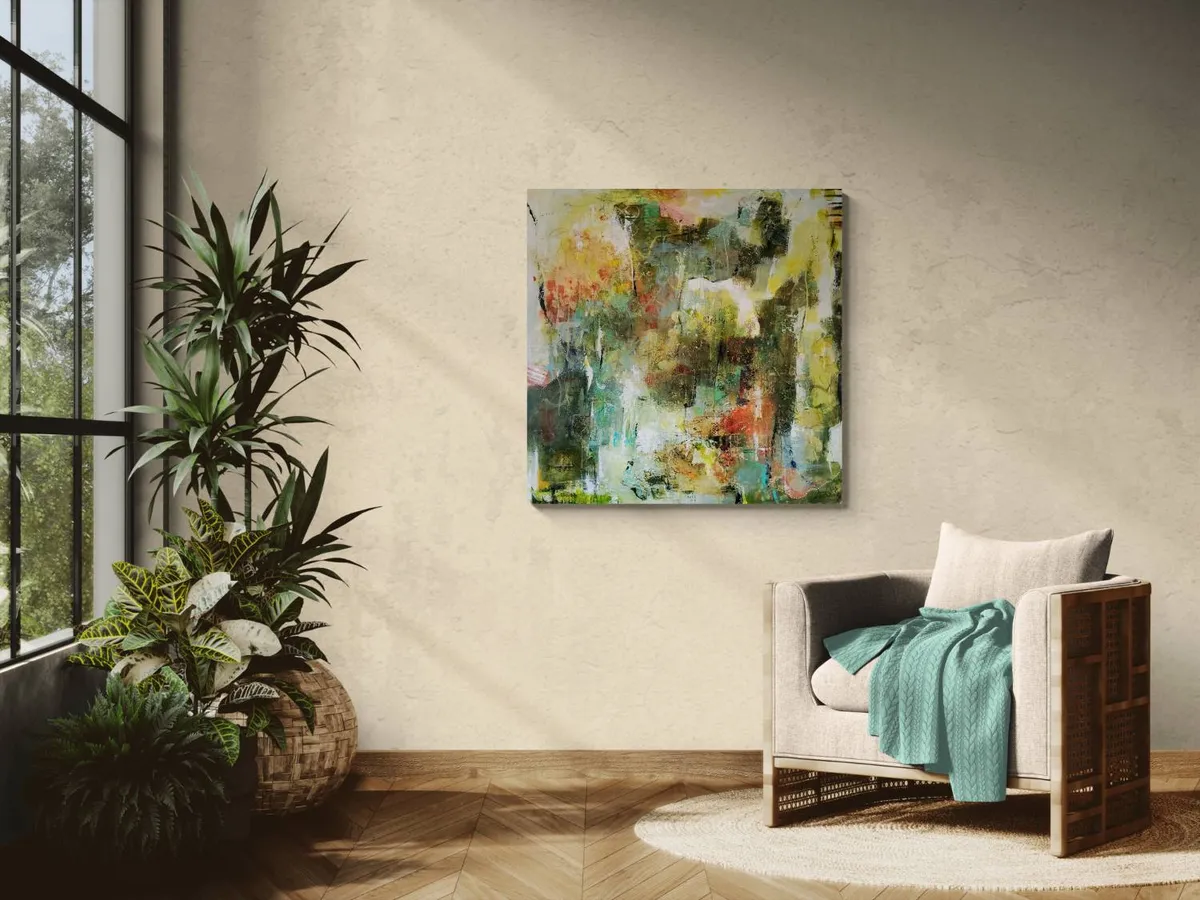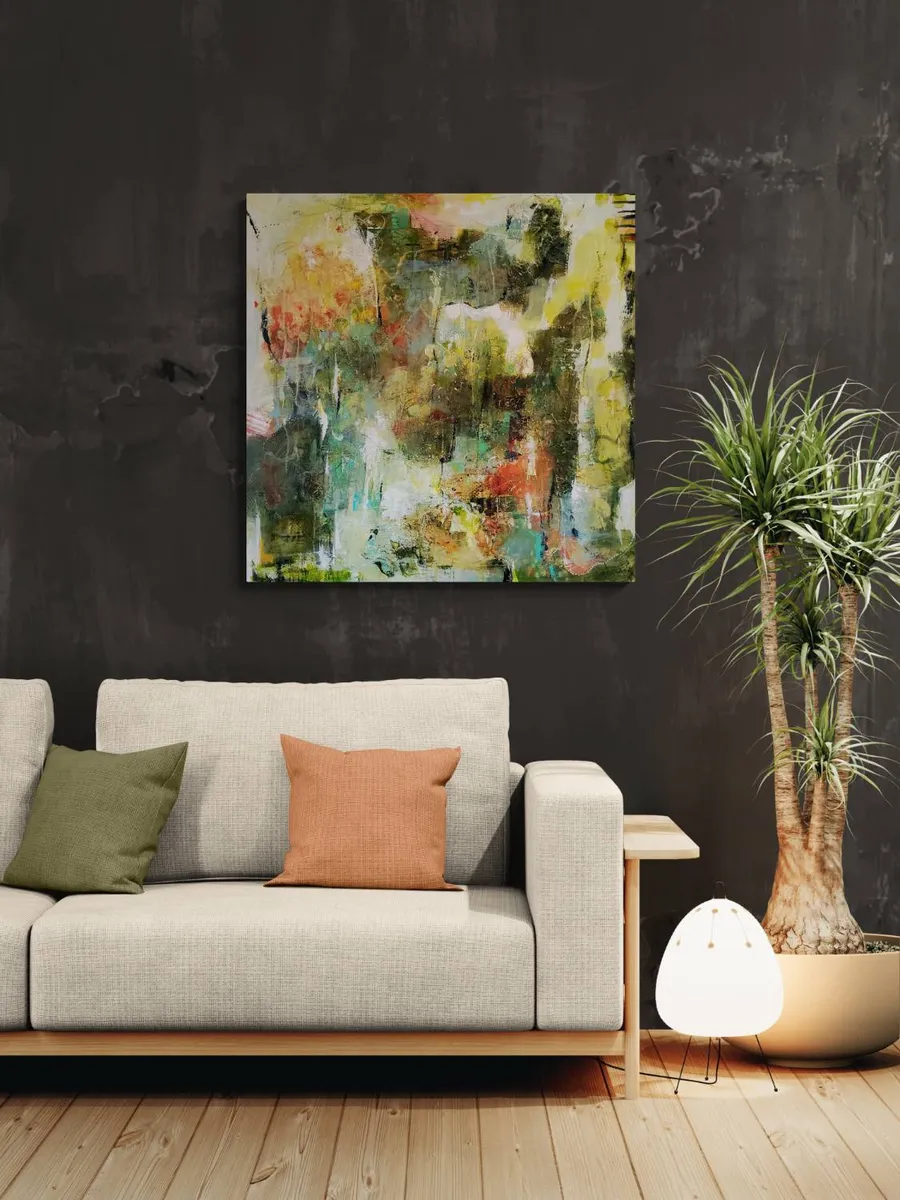 Professionelle malemedier på kvalitetslærred. Et maleri med struktur lavet med collagepapir. Påsat små stykker træflis. Detaljer i guld reflekterer lyset og understreger varmen i maleriet. Kanten er malet sort og kan enten gemmes i en ramme eller fungere som en ramme i sig selv. Signatur i guld