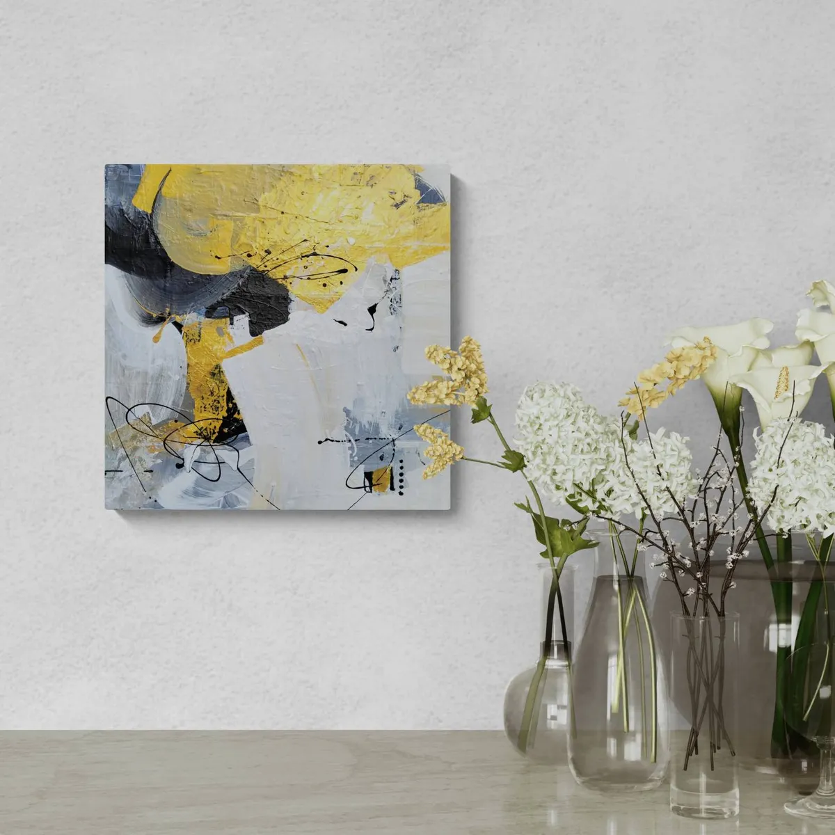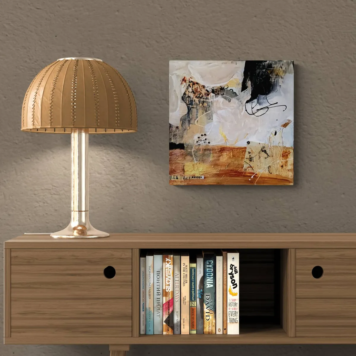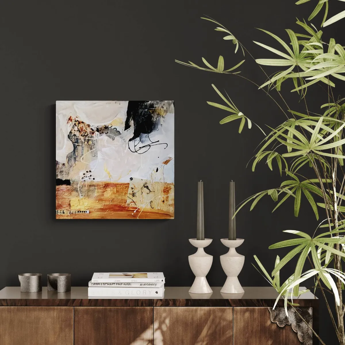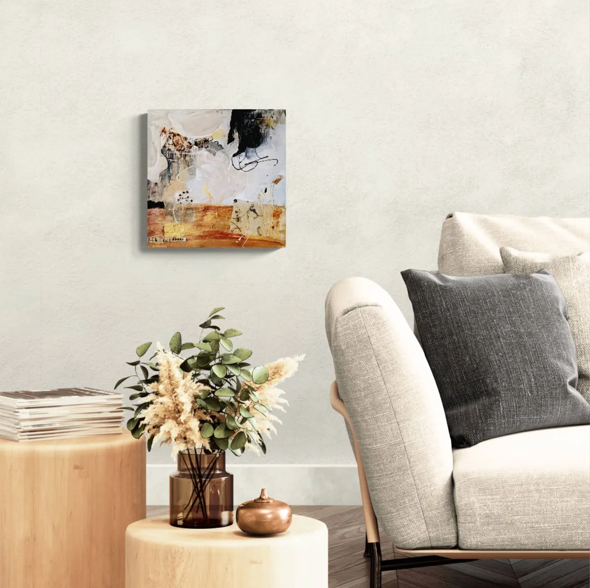 Professionelle malemedier på kvalitetslærred. Et maleri med struktur lavet med collagepapir og med teknikken vådt-i-vådt. Detaljer i guld reflekterer lyset og tilfører varme til maleriet. Kanten er malet sort og kan enten gemmes i en ramme eller fungere som en ramme i sig selv. Signatur i guld