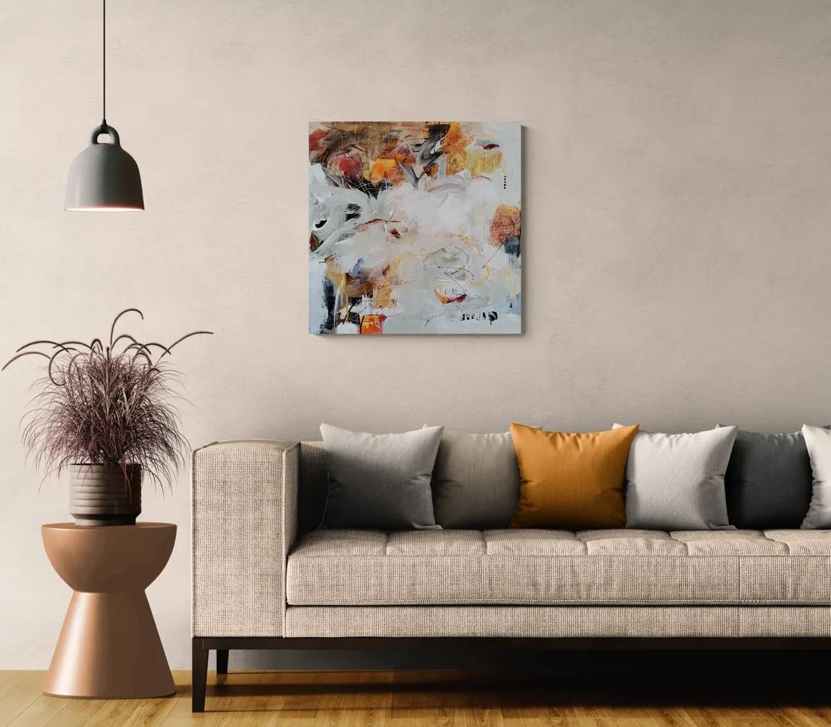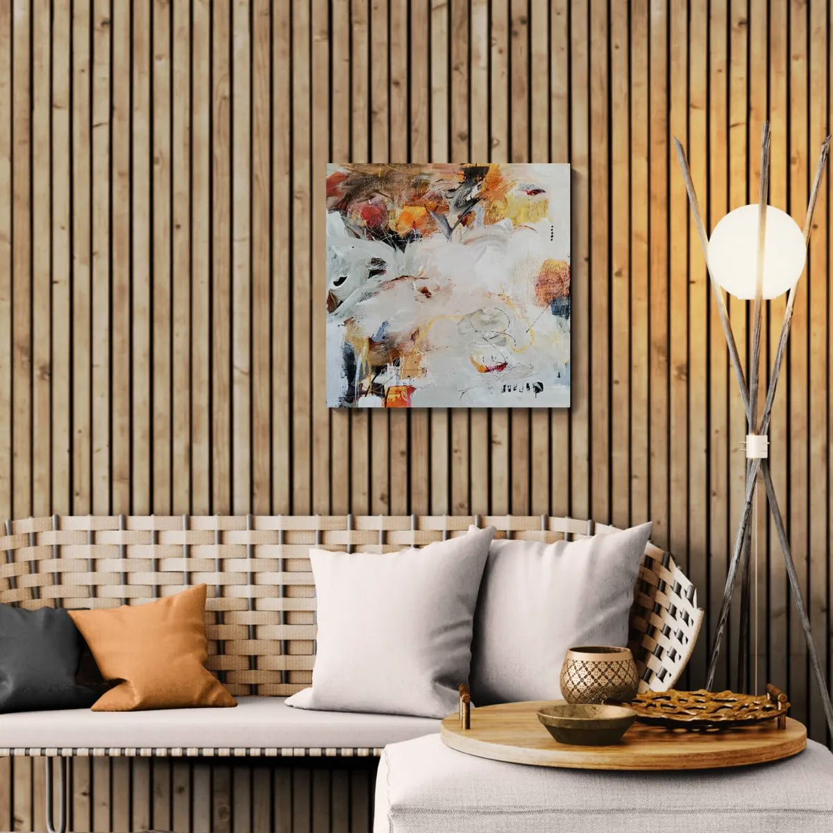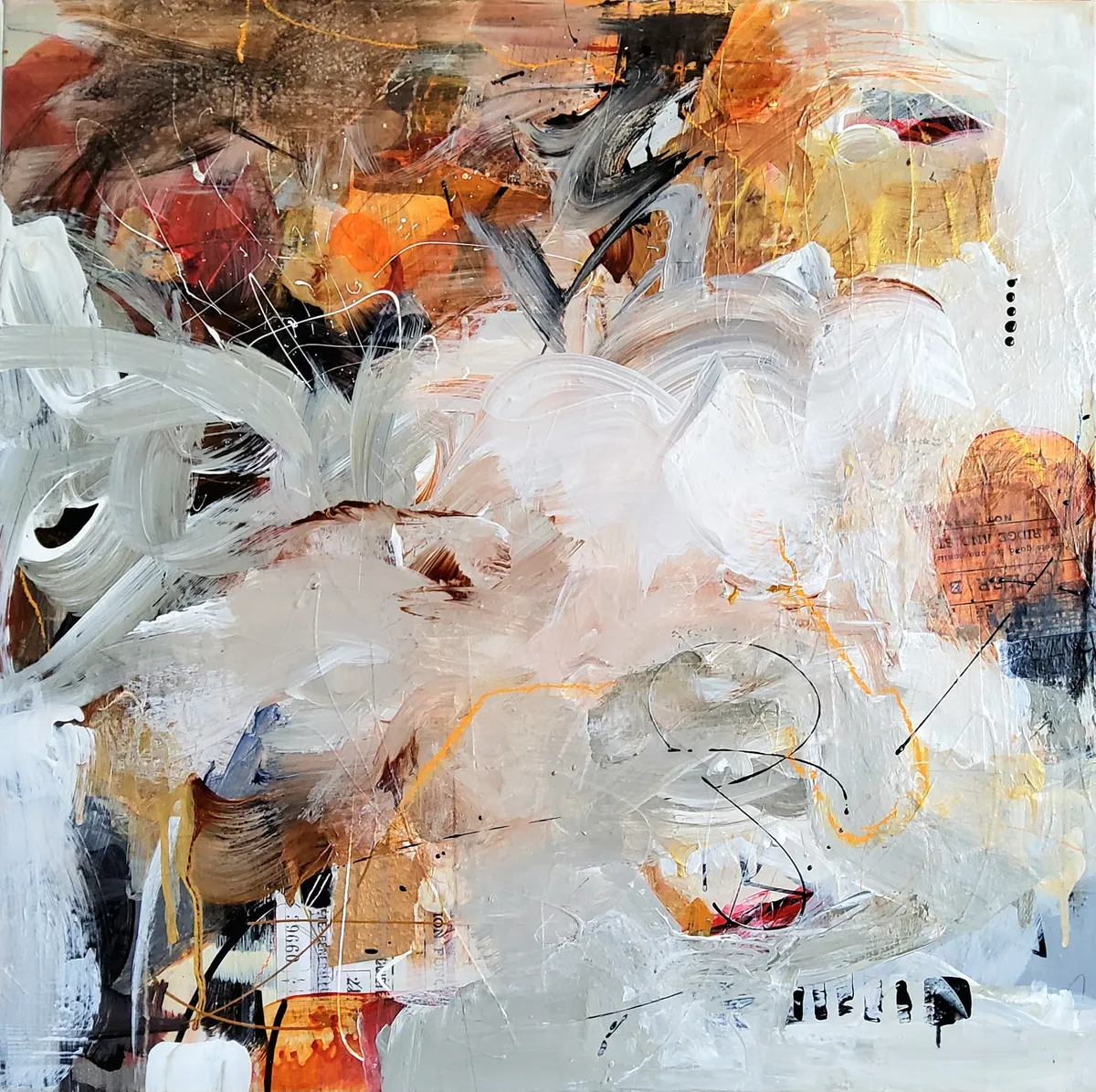 Professionelle malemedier på kvalitetslærred. Et maleri med kraftig struktur lavet med collagepapir, stof og med teknikken vådt-i-vådt. Detaljer i guld reflekterer lyset og tilfører varme til maleriet. Kanten er malet sort og kan enten gemmes i en ramme eller fungere som en ramme i sig selv. Signatur i guld