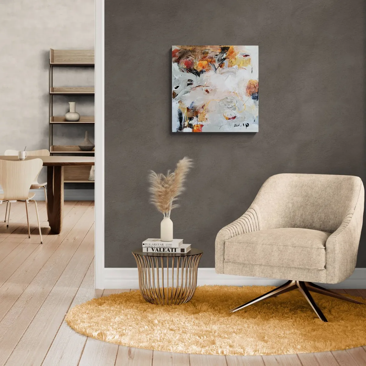Professionelle malemedier på kvalitetslærred. Et maleri med kraftig struktur lavet med collagepapir og med teknikken vådt-i-vådt. Detaljer i guld reflekterer lyset og tilfører varme til maleriet. Kanten er malet sort og kan enten gemmes i en ramme eller fungere som en ramme i sig selv. Signatur i guld